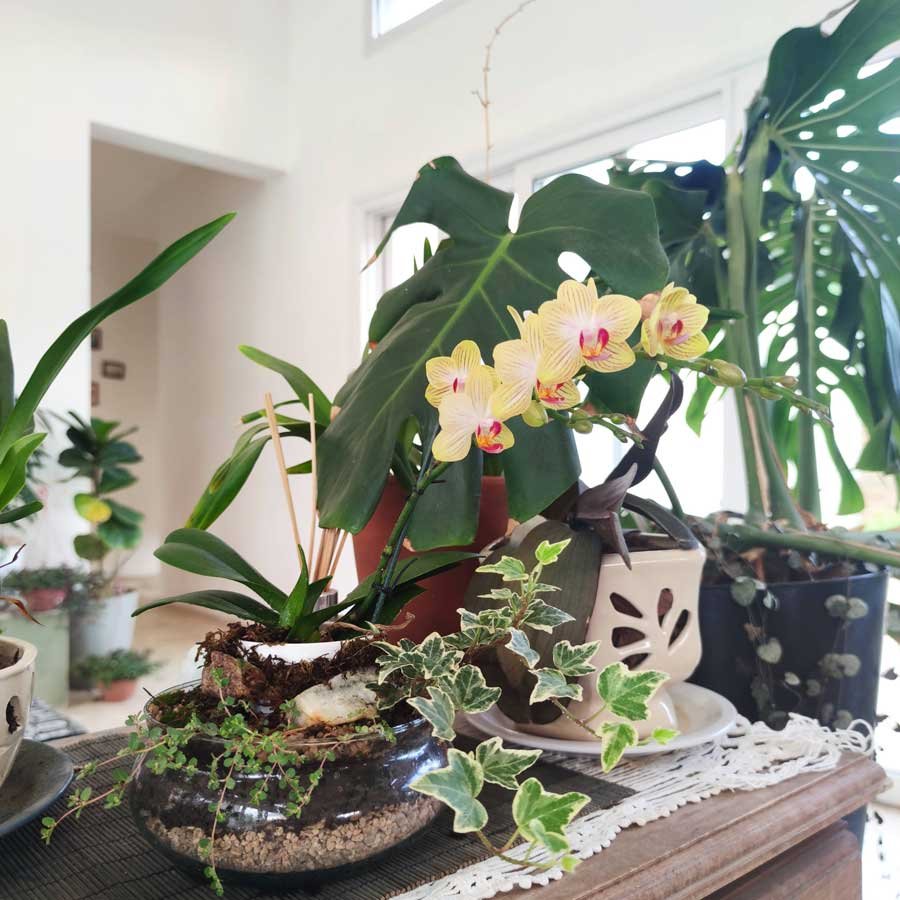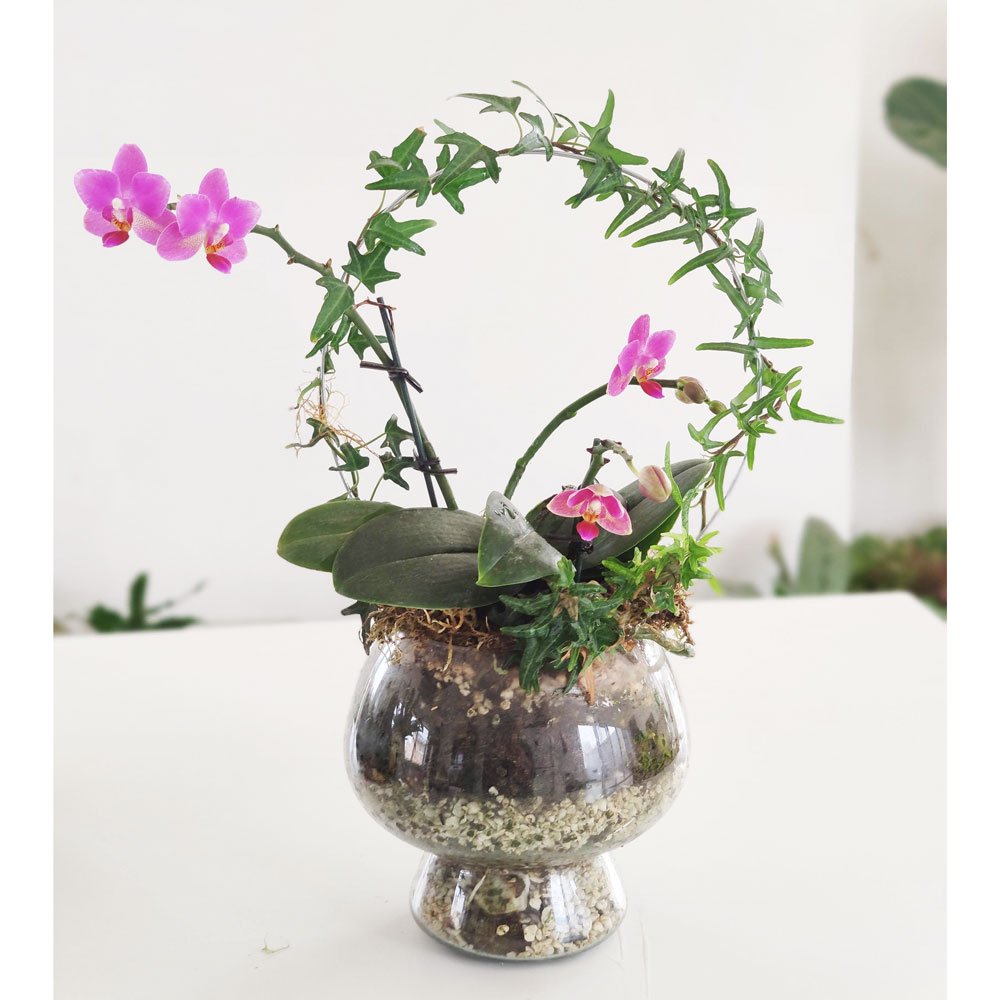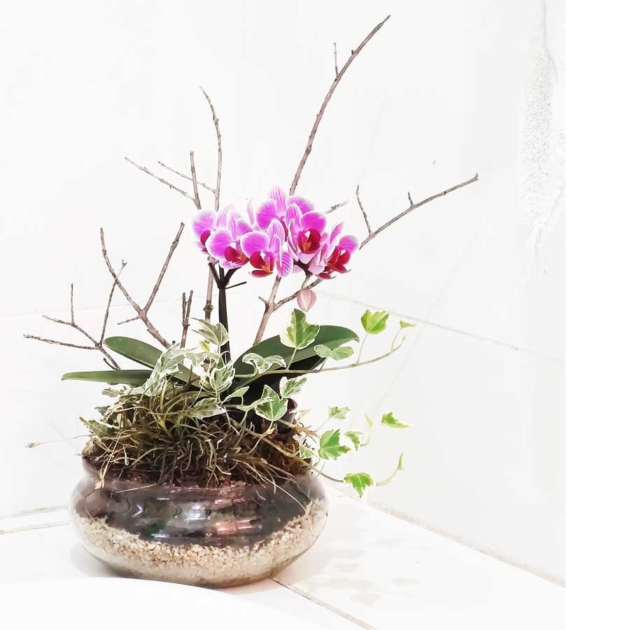 Orquídeas en arreglo con plantas y recipiente de vidrio.