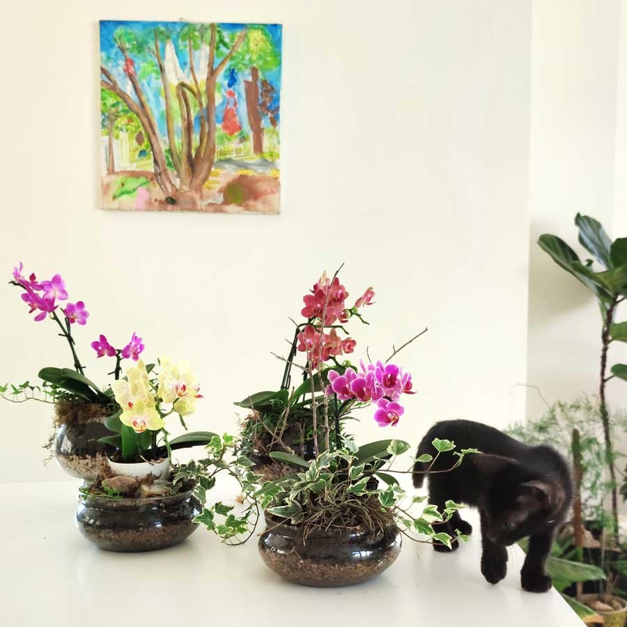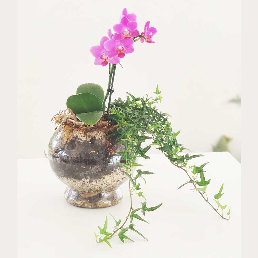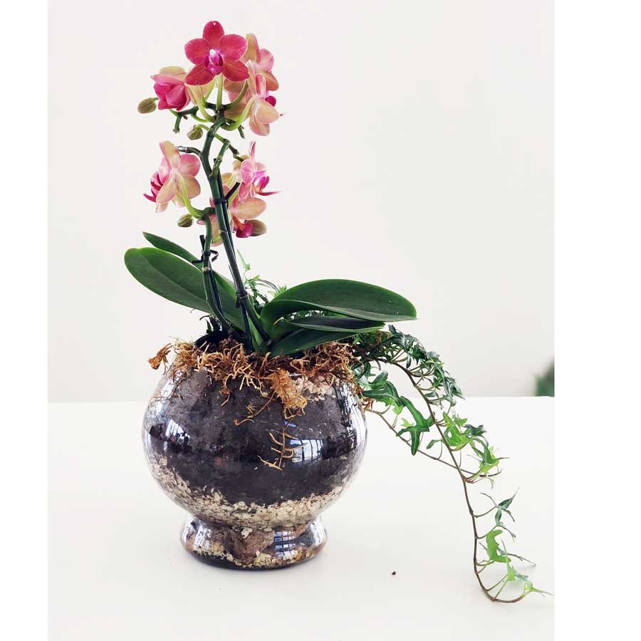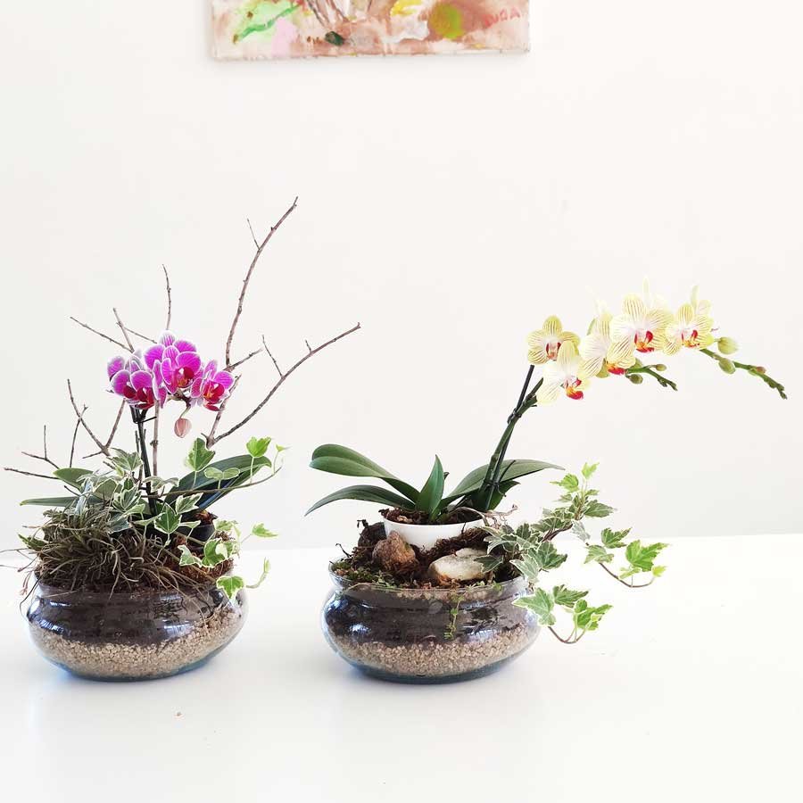 Hay 2 modelos de recipiente y las mini orquídeas varían de acuerdo a la disponibilidad del momento.